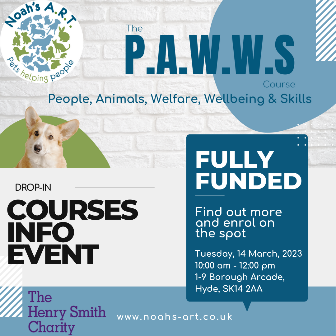 Come along on Tuesday 14th March, 10am-12pm, to find out more about our fully-funded courses in animal welfare and mental health awareness. Contact us at admin@noahs-art.co.uk / 0161 368 6544 with any questions.